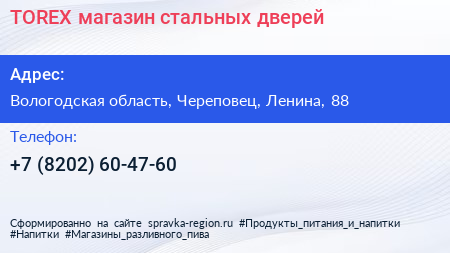 TOREX, магазин стальных дверей по адресу Вологодская область, Череповец, Ленина, 88 в дальнейшем Организация, размещена в следующих категориях: