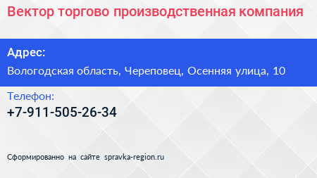 Вектор, торгово-производственная компания по адресу Вологодская область, Череповец, Осенняя улица, 10 в дальнейшем Организация, размещена в следующих категориях: