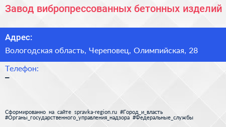 Завод вибропрессованных бетонных изделий по адресу Вологодская область, Череповец, Олимпийская, 28 в дальнейшем Организация, размещена в следующих категориях: