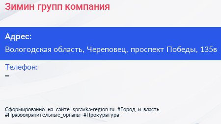Зимин групп, компания по адресу Вологодская область, Череповец, проспект Победы, 135в в дальнейшем Организация, размещена в следующих категориях: