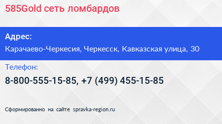 585Gold, сеть ломбардов по адресу Карачаево-Черкесия, Черкесск, Кавказская улица, 30 в дальнейшем Организация, размещена в следующих категориях: