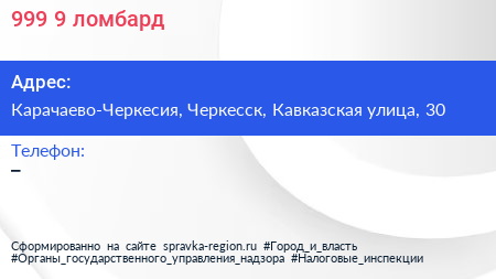 999,9, ломбард по адресу Карачаево-Черкесия, Черкесск, Кавказская улица, 30 в дальнейшем Организация, размещена в следующих категориях:
