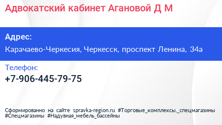 Адвокатский кабинет Агановой Д.М. по адресу Карачаево-Черкесия, Черкесск, проспект Ленина, 34а в дальнейшем Организация, размещена в следующих категориях: