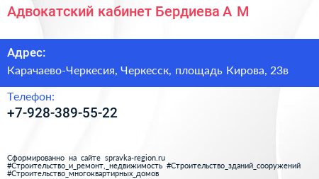 Адвокатский кабинет Бердиева А.М. по адресу Карачаево-Черкесия, Черкесск, площадь Кирова, 23в в дальнейшем Организация, размещена в следующих категориях: