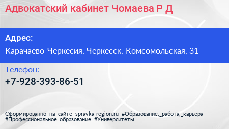 Адвокатский кабинет Чомаева Р.Д. по адресу Карачаево-Черкесия, Черкесск, Комсомольская, 31 в дальнейшем Организация, размещена в следующих категориях:
