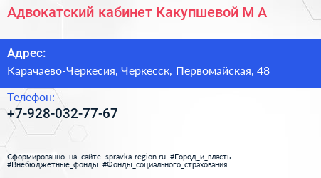 Адвокатский кабинет Какупшевой М.А. по адресу Карачаево-Черкесия, Черкесск, Первомайская, 48 в дальнейшем Организация, размещена в следующих категориях: