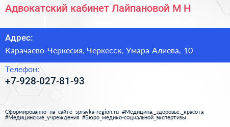 Адвокатский кабинет Лайпановой М.Н. по адресу Карачаево-Черкесия, Черкесск, Умара Алиева, 10 в дальнейшем Организация, размещена в следующих категориях: