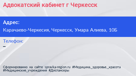 Адвокатский кабинет, г. Черкесск по адресу Карачаево-Черкесия, Черкесск, Умара Алиева, 10Б в дальнейшем Организация, размещена в следующих категориях: