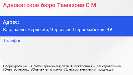 Адвокатское бюро Тамазова С.М. по адресу Карачаево-Черкесия, Черкесск, Первомайская, 49 в дальнейшем Организация, размещена в следующих категориях: