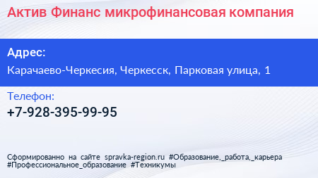 Актив Финанс, микрофинансовая компания по адресу Карачаево-Черкесия, Черкесск, Парковая улица, 1 в дальнейшем Организация, размещена в следующих категориях: