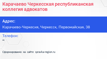 Карачаево-Черкесская республиканская коллегия адвокатов по адресу Карачаево-Черкесия, Черкесск, Первомайская, 38 в дальнейшем Организация, размещена в следующих категориях: