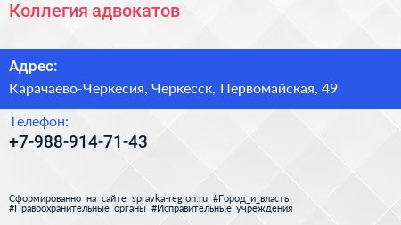 Коллегия адвокатов по адресу Карачаево-Черкесия, Черкесск, Первомайская, 49 в дальнейшем Организация, размещена в следующих категориях: