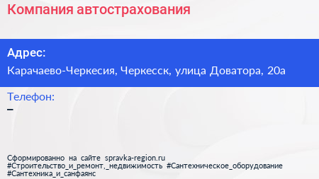 Компания автострахования по адресу Карачаево-Черкесия, Черкесск, улица Доватора, 20а в дальнейшем Организация, размещена в следующих категориях: