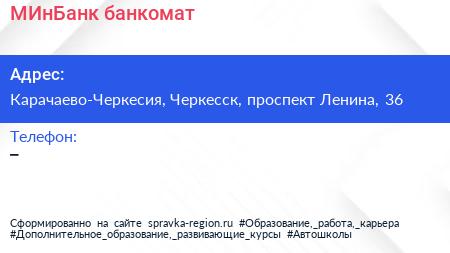 МИнБанк, банкомат по адресу Карачаево-Черкесия, Черкесск, проспект Ленина, 36 в дальнейшем Организация, размещена в следующих категориях: