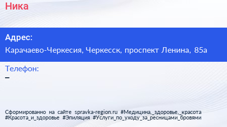 Ника по адресу Карачаево-Черкесия, Черкесск, проспект Ленина, 85а в дальнейшем Организация, размещена в следующих категориях: