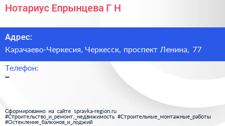 Нотариус Епрынцева Г.Н. по адресу Карачаево-Черкесия, Черкесск, проспект Ленина, 77 в дальнейшем Организация, размещена в следующих категориях: