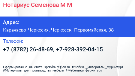 Нотариус Семенова М.М. по адресу Карачаево-Черкесия, Черкесск, Первомайская, 38 в дальнейшем Организация, размещена в следующих категориях: