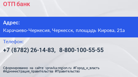ОТП банк по адресу Карачаево-Черкесия, Черкесск, площадь Кирова, 21а в дальнейшем Организация, размещена в следующих категориях: