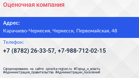 Оценочная компания по адресу Карачаево-Черкесия, Черкесск, Первомайская, 48 в дальнейшем Организация, размещена в следующих категориях: