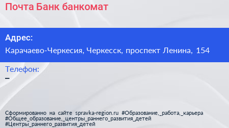 Почта Банк, банкомат по адресу Карачаево-Черкесия, Черкесск, проспект Ленина, 154 в дальнейшем Организация, размещена в следующих категориях: