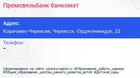 Промсвязьбанк, банкомат по адресу Карачаево-Черкесия, Черкесск, Орджоникидзе, 22 в дальнейшем Организация, размещена в следующих категориях: