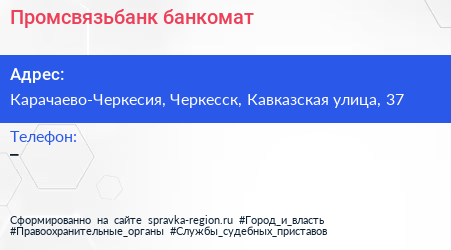 Промсвязьбанк, банкомат по адресу Карачаево-Черкесия, Черкесск, Кавказская улица, 37 в дальнейшем Организация, размещена в следующих категориях: