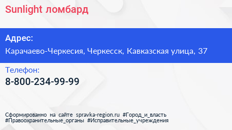 Sunlight, ломбард по адресу Карачаево-Черкесия, Черкесск, Кавказская улица, 37 в дальнейшем Организация, размещена в следующих категориях: