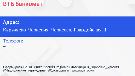 ВТБ, банкомат по адресу Карачаево-Черкесия, Черкесск, Гвардейская, 1 в дальнейшем Организация, размещена в следующих категориях: