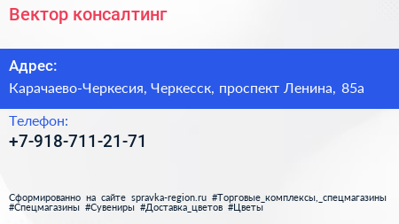 Вектор консалтинг по адресу Карачаево-Черкесия, Черкесск, проспект Ленина, 85а в дальнейшем Организация, размещена в следующих категориях: