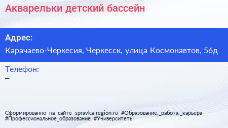 Акварельки, детский бассейн по адресу Карачаево-Черкесия, Черкесск, улица Космонавтов, 56д в дальнейшем Организация, размещена в следующих категориях: