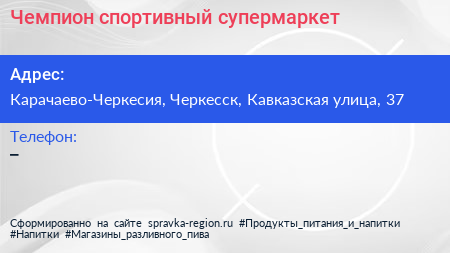 Чемпион, спортивный супермаркет по адресу Карачаево-Черкесия, Черкесск, Кавказская улица, 37 в дальнейшем Организация, размещена в следующих категориях: