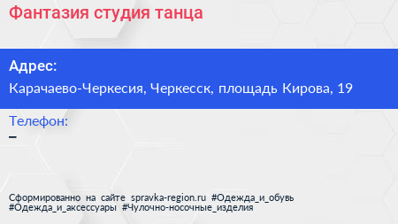 Фантазия, студия танца по адресу Карачаево-Черкесия, Черкесск, площадь Кирова, 19 в дальнейшем Организация, размещена в следующих категориях: