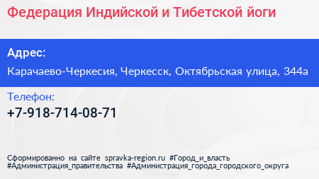 Федерация Индийской и Тибетской йоги по адресу Карачаево-Черкесия, Черкесск, Октябрьская улица, 344а в дальнейшем Организация, размещена в следующих категориях: