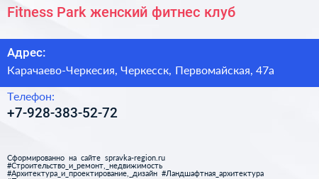 Fitness Park, женский фитнес-клуб по адресу Карачаево-Черкесия, Черкесск, Первомайская, 47а в дальнейшем Организация, размещена в следующих категориях: