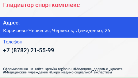 Гладиатор, спорткомплекс по адресу Карачаево-Черкесия, Черкесск, Демиденко, 26 в дальнейшем Организация, размещена в следующих категориях: