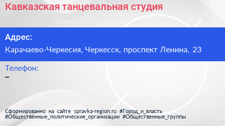 Кавказская танцевальная студия по адресу Карачаево-Черкесия, Черкесск, проспект Ленина, 23 в дальнейшем Организация, размещена в следующих категориях: