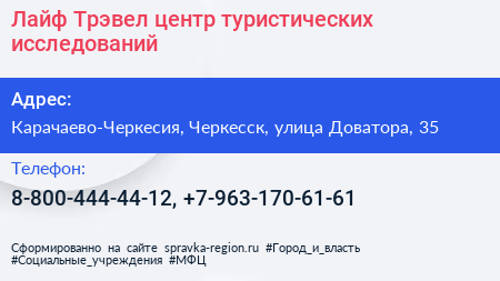 Лайф Трэвел, центр туристических исследований по адресу Карачаево-Черкесия, Черкесск, улица Доватора, 35 в дальнейшем Организация, размещена в следующих категориях: