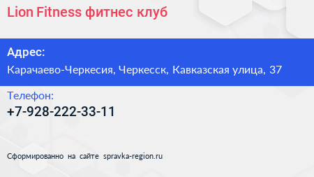 Lion Fitness, фитнес-клуб по адресу Карачаево-Черкесия, Черкесск, Кавказская улица, 37 в дальнейшем Организация, размещена в следующих категориях: