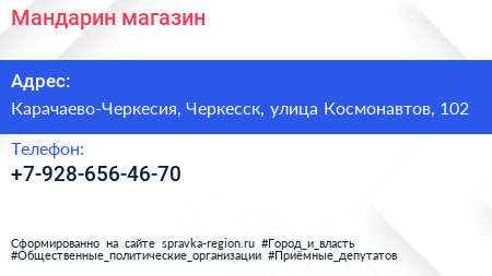 Мандарин, магазин по адресу Карачаево-Черкесия, Черкесск, улица Космонавтов, 102 в дальнейшем Организация, размещена в следующих категориях: