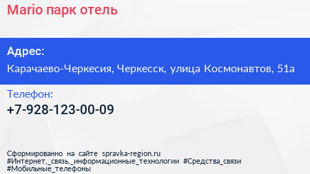 Mario, парк-отель по адресу Карачаево-Черкесия, Черкесск, улица Космонавтов, 51а в дальнейшем Организация, размещена в следующих категориях: