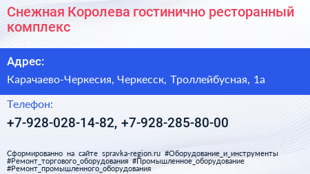 Снежная Королева, гостинично-ресторанный комплекс по адресу Карачаево-Черкесия, Черкесск, Троллейбусная, 1а в дальнейшем Организация, размещена в следующих категориях: