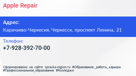 Apple Repair по адресу Карачаево-Черкесия, Черкесск, проспект Ленина, 21 в дальнейшем Организация, размещена в следующих категориях: