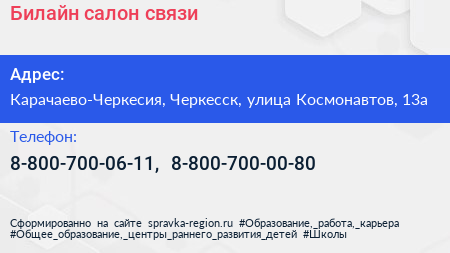 Билайн, салон связи по адресу Карачаево-Черкесия, Черкесск, улица Космонавтов, 13а в дальнейшем Организация, размещена в следующих категориях: