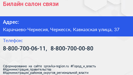 Билайн, салон связи по адресу Карачаево-Черкесия, Черкесск, Кавказская улица, 37 в дальнейшем Организация, размещена в следующих категориях: