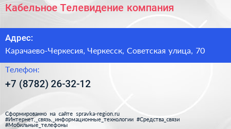 Кабельное Телевидение, компания по адресу Карачаево-Черкесия, Черкесск, Советская улица, 70 в дальнейшем Организация, размещена в следующих категориях: