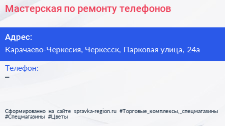 Мастерская по ремонту телефонов по адресу Карачаево-Черкесия, Черкесск, Парковая улица, 24а в дальнейшем Организация, размещена в следующих категориях:
