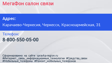 МегаФон, салон связи по адресу Карачаево-Черкесия, Черкесск, Красноармейская, 31 в дальнейшем Организация, размещена в следующих категориях: