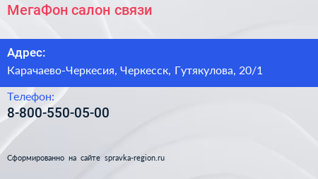 МегаФон, салон связи по адресу Карачаево-Черкесия, Черкесск, Гутякулова, 20/1 в дальнейшем Организация, размещена в следующих категориях: