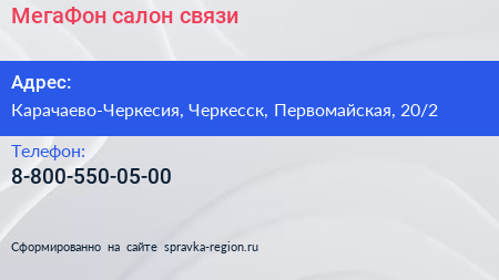 МегаФон, салон связи по адресу Карачаево-Черкесия, Черкесск, Первомайская, 20/2 в дальнейшем Организация, размещена в следующих категориях: