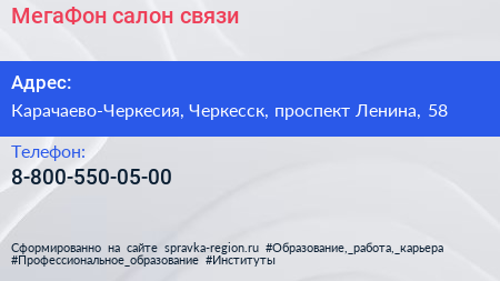 МегаФон, салон связи по адресу Карачаево-Черкесия, Черкесск, проспект Ленина, 58 в дальнейшем Организация, размещена в следующих категориях: